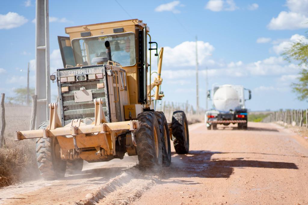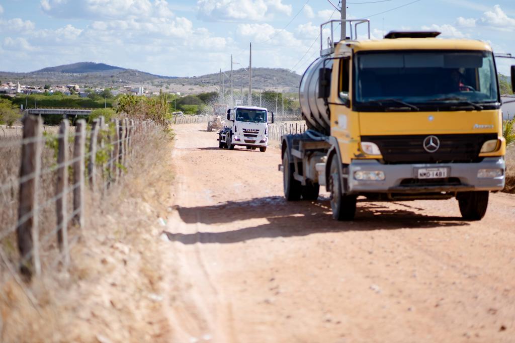 Devido ao período de longa estiagem, a terra seca e endurecida dificulta a execução do serviço. A molha prévia é fundamental para facilitar o trabalho da máquina, reduzir o risco de danos aos equipamentos e garantir um melhor acabamento da via.